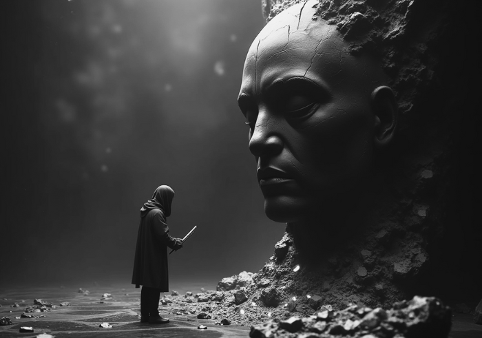 A lone sculptor in a vast, empty void, carving a statue out of pure darkness. The figure is faceless, their chisel leaving behind glowing silver fractures in the obsidian surface. A surreal, eerie composition with deep blacks and metallic reflections. Ultra-detailed, cinematic lighting, high contrast.