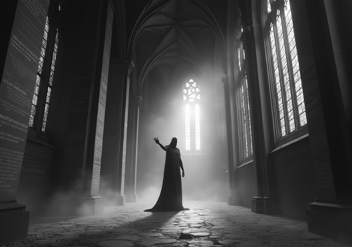 A vast, abandoned cathedral where walls are inscribed with flowing text that moves like living ink. The stained-glass windows emit no light—only shifting shadows. In the center, a faceless figure reaches out, their hand dissolving into words. The atmosphere is heavy, gothic, and mysterious. Color palette: Black, white, and carbon silver. Ultra-detailed, cinematic chiaroscuro lighting.