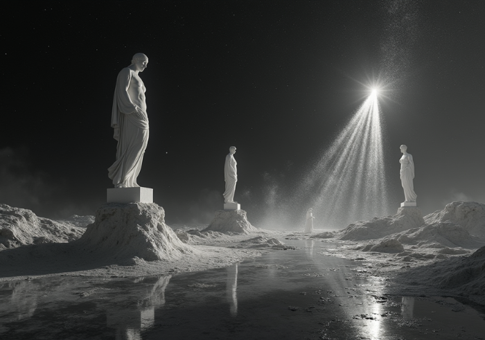 A surreal landscape where floating marble statues disintegrate into streams of digital data, dissolving into the night sky. The ground is reflective, mirroring an endless void of stars and neural pathways. A deep, mysterious atmosphere with a high-contrast monochrome aesthetic. Ultra-realistic, darkly poetic composition.