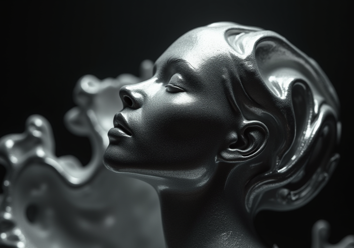 A futuristic AI-generated abstract sculpture, representing the fluidity of thoughts. Dark atmosphere with silver and carbon textures. Ultra-detailed, cinematic lighting. Monochrome color palette: Black, White, Grey.